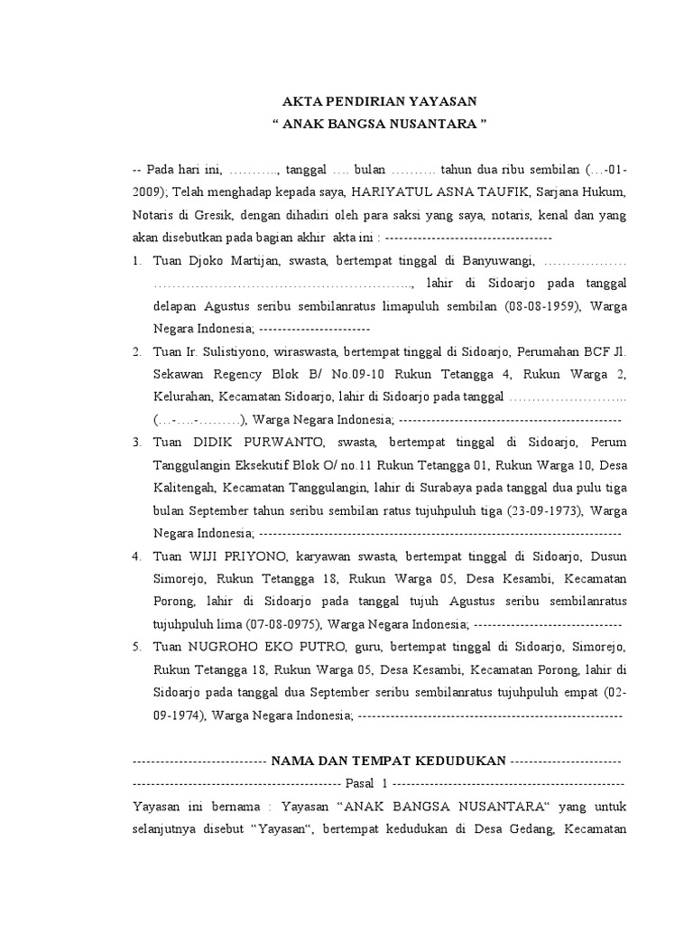 Berikut ini adalah contoh akta pendirian yayasan berdasarkan uu no. Semua kekayaan yayasan harus dipergunakan untuk mencapai maksud dan. Hari se l asa tanggal 18 dese m ber 2012. Contoh surat perjanjian pendirian yayasan mendirikan yayasan merupakan cara yang bagus untuk memulai sebuah aktifitas sosial. Pendirian yayasan dilakukan dengan akta notaris dan dibuat dalam bahasa indonesia yang berisi kesepakatan para pendiri untuk melaksanakan kegiatan yayasan dalam bidang sosial keagamaan dan kemanusiaan. Adapun hal hal yang harus dipersiapkan sebelum menghadap notaris adalah nama para pendiri yayasan.