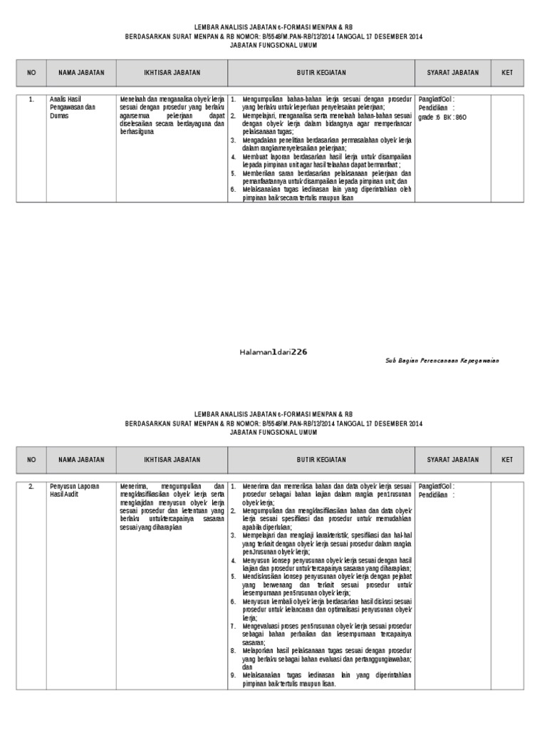 Contoh analisis jabatan fungsional umum. Jabatan adalah kedudukan yang menunjukan tugas tanggung jawab wewenang dan hak seorang pns dalam suatu satuan kerja organisasi negara. Bendahara perawat dokter analis penyelia pemeriksa pengevaluasi pengendali penguji verifikator pengambil sampel. Analisis jabatan pengertian makalah metode contoh pentingnnya analisis jabatan adalah kegiatan untuk menciptakan landasan atau pedoman bagi penerimaan dan penempatan karyawan. 28 junl2011 pedoman pelaksanaan analisis jabatan i. Dengan demikian kagiatan perencanaan sdm tidak terlepas dari analisis jabatan. Pengertian analisis jabatan analisis jabatan pengertian makalah metode contoh pentingnnya analisis jabatan adalah kegiatan untuk menciptakan landasan atau pedoman bagi penerimaan dan penempatan karyawan.