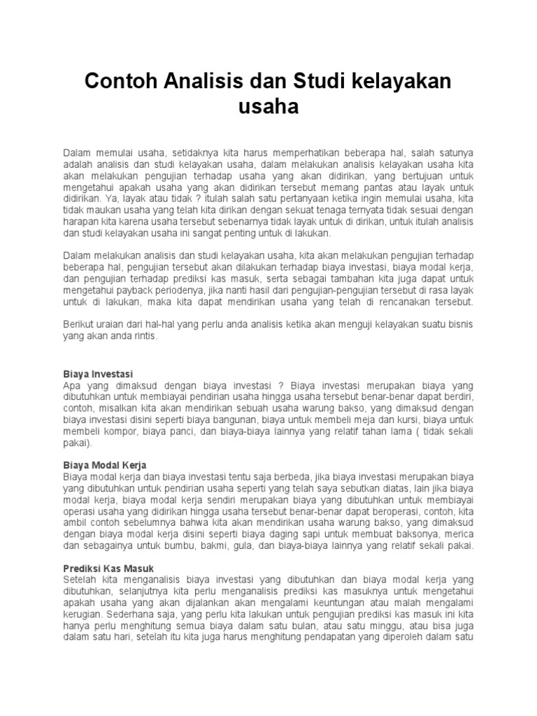 Contoh analisis dan studi kelayakan usaha dalam memulai usaha setidaknya kita harus memperhatikan beberapa hal salah satunya adalah analisis dan studi kelayakan usaha dalam melakukan analisis kelayakan usaha kita akan melakukan pengujian terhadap usaha yang akan didirikan yang bertujuan untuk mengetahui apakah usaha yang akan didirikan tersebut memang pantas atau layak untuk didirikan. Analisis kelayakan usaha dan analisis swot. Contoh studi kelayakan usaha kecil. Pada saat merintis usaha sebaiknya gunakanlah modal pribadi atau pinjaman lunak yang tidak mengikat biasanya pinjaman seperti ini berasal dari keluarga atau sahabat. Contoh proposal studi kelayakan bisnis skb. Studi kelayakan bisnis pengertian manfaat aspek materi tahapan contoh.