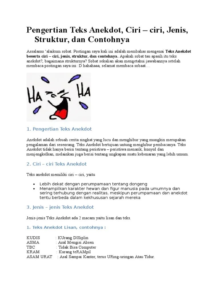 Contoh teks anekdot anekdot adalah suatu cerita lucu yang di buat untuk menghibur menyindir dan menyampaikan ilmu. Di antaranya adalah struktur kaidah atau unsur kebahasaan ciri ciri dan tujuan teks anekdot. Daftar isi1 pengertian anekdot2 ciri ciri teks anekdot3 struktur dan unsur unsur teks anekdot31 1. Contoh teks anekdot lucu dan menyindir. Presiden indonesia kemudian bercerita mengenai presiden presiden yang pernah menjabat di nusantara. Anekdot merupakan cerita singkat yang di dalamnya mengandung unsur menyindir yang bersifat lucu atau humor.