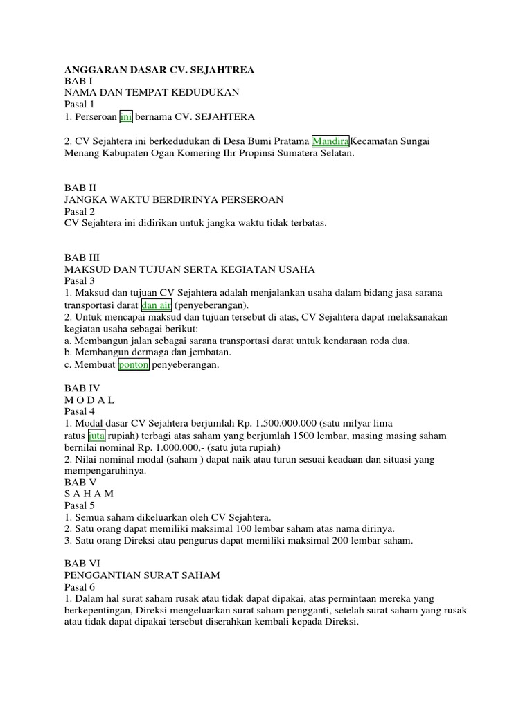 Demikian dengan mengindahkan ketentuan anggaran dasar dan peraturan perundang undangan yang berlaku di bidang pasar modal serta peraturan bursa efek. Anggota biasa ab yang diterima menjadi anggota biasa ab adalah warga negara indonesia yang memiliki persyaratan sebagai berikut. Perseroan ini bernama perseroan komanditer. Academiaedu is a platform for academics to share research papers. Anggaran dasar pt mencantumkan tugas dan tanggung jawab serta hak dan kewajiban seluruh organ pt sehingga anggaran. Cv cipta karya berdikari.