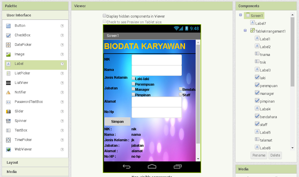 Contoh aplikasi app inventor. Mit app inventor merupakan platform untuk memudahkan proses pembuatan aplikasi sederhana tanpa harus mempelajari atau menggunakan bahasa pemrograman yang terlalu banyak. Cara mudah membuat aplikasi menggunakan mit app inventor. Nizar fahmi 20820 views. App inventor mit app inventor adalah aplikasi pemrograman berbasis block yang memungkinkan semua orang bahkan pemula untuk memulai pemrograman dan membangun aplikasi yang berfungsi penuh untuk perangkat android. App inventor menggunakan antarmuka grafis sangat mirip dengan scratch dan antarmuka starlogo tng yang memungkinkan pengguna untuk menarik dan melepas objek visual untuk membuat aplikasi yang dapat berjalan di perangkat android. Membuat contoh aplikasi sederhana dengan app inventor sebelum memulai membuat aplikasi ada prerequisite program yang dibutuhkan untuk menjalankan app inventor ini untuk membuka block editornya.