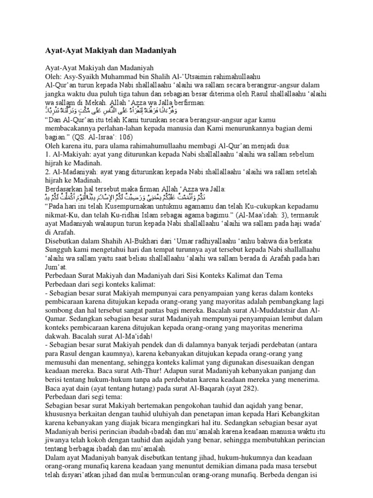 Contoh ayat makkiyah dan madaniyah. Ciri ciri khas ayat ayat makkiyah dan madaniyah. Dengan menyebutkan surah makkiyah dan madaniyah tidak berarti bahwa semua makkiyah dan madaniyah adalah karena dalam surah makkiyah terkadang ada ayat ayat madaniyah dan dalam surah madaniyah kadang kadang ada juga ayat ayat makkiyah. Pada umumnya surah surah makkiyah mudah dihafal karena ayat ayat pendek sedangkat sebaliknya pada surat madaniyah ayat ayatnya terlalu panjang. Mekah dan madinah adalah dua tempat turunnya ayat ayat alquran al karim dan. Berisi tentang hukum dan perundang undangan. Manna al qaththan mencoba lebih jauh lagi dalam mendeskripsikan urgensi mengetahui makkiyah dan madaniyyah adalah untun membantu dalam menafsirkan al quran pedoman bagi langkah langkah dakwah memberi informasi tentang sirah kenabian mudah diketahui mana ayat ayat yang turun lebih dahulu dan mana ayat yang turun belakangan dari kitab suci al quran dan mudah diketahui mana ayat ayat al.