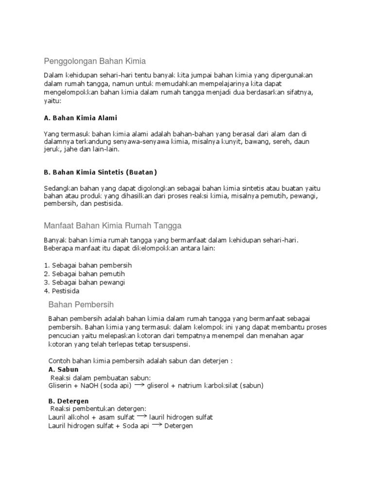 Contoh bahan kimia dalam kehidupan sehari hari. Macam macam jenis bahan kimia dalam kehidupan sehari hari lengkap. Asam klorida hcl asam klorida digunakan sebagai pengawet baja produksi senyawa organik dan anorganik kontrol ph dan netralisasi regenerasi penukaran ion pengolahan kulit pemurnian garam biasa pembersih rumah tangga konstruksi bangunan dan pengasaman sumur minyak. Banyak jenis bahan pembersih yang digunakan dalam rumah tangga seperti pembersih pakaian tubuh lantai dan kendaraan. Tubuh kitaa hidup dan tumbuh berkat reaksi kimia. Selain zat yang menimbulkan aroma wangi pewangi yang dijual di pasaran biasanya mengandung zat zat lain seperti alcohol untuk pewangi yang berbentuk cair dan tawas untuk pewangi yang berbentuk padat. Pewangi merupakan bahan kimia lain yang erat kaitannya dengan kehidupan kita sehari hari.