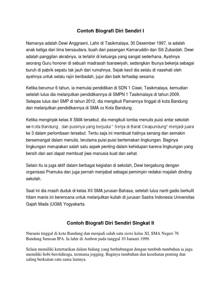 Mulai dari contoh teks biografi pahlawan atlet penulis diri sendiri artis orang tua teman. Lengkap dengan cara membuat. Namaku intan permata lahir di kendal tanggal 12 februari 1998. Contoh biografi diri sendiri berbeda dengan anggapan sebagian orang sebenarnya membuat sebuah biografi atau autobiografi tidaklah sesulit yang dibayangkan. Contoh biografi biografi adalah salah satu jenis teks yang menjelaskan tentang kehidupan seseorang secara lengkap. Memang perlu trik khusus untuk membuat teks sejenis biografi atau autobigrafi menjadi karangan yang enak untuk dibaca dan mudah dipahami.