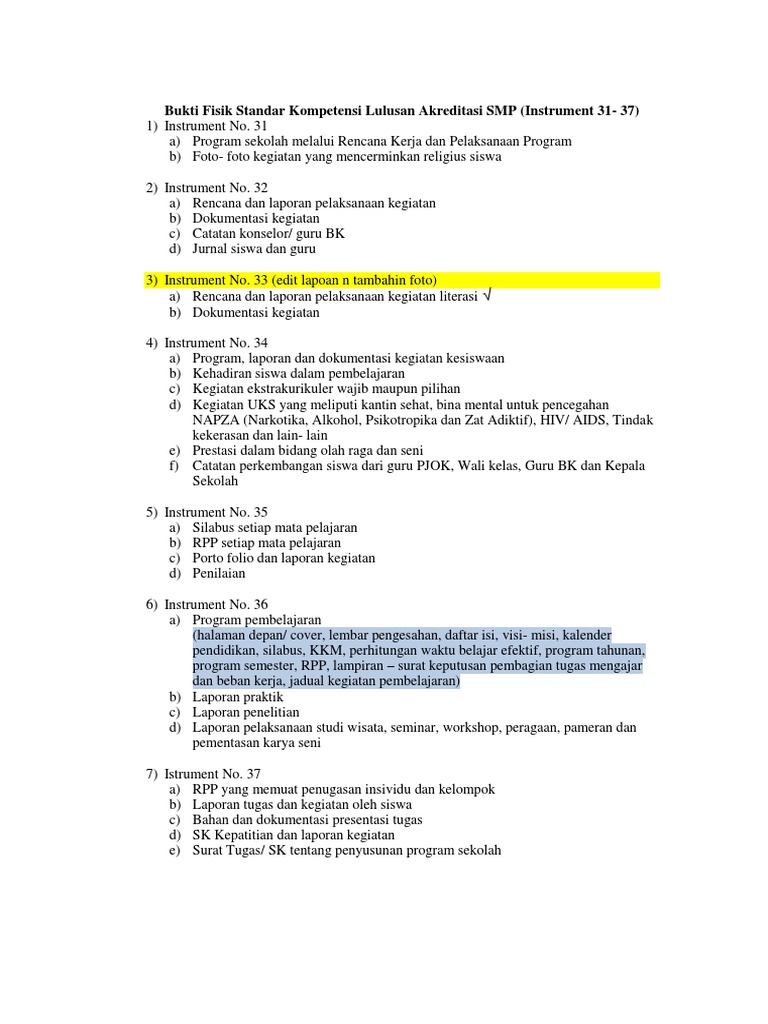 Bukti fisik skl akreditasi smp mts 2017 standar kompetensi lulusan instrumen no31 37 yang mungkin anda cari saat inimaka tepat sekali mengunjungi blog kami karena dalam kali ini admin akan memudahkan anda semua dalam mencari tentang bukti fisik akreditasi smp download dan sudah pasti juga anda bisa mendapatkan file instrumen akreditasi smp 2017 pdf secara lengkap untuk bahan akreditas yang. Bukti fisik akreditasi smp mts skl standar kompetensi lulusan instrumen no31 37 ini merupakan perangkat terbaru yang akan saya bagikan dalam kesempatan kali ini khususnya untuk memnuhi kebutuhan pelaksanaan akreditasi sekolah. File ini akan dibutuhkan khususnya dalam proses visitasi oleh asesor untuk menijau bukti fisik akreditasi smp download dan dan bagi yang. Dalam kesempatan kali ini saya akan share kepada anda berkaitan dengan bukti fisik standar kompetensi lulusan skl akreditasi smp yang berjumlah 7 dari 124 instrumen dalam standar lainnya. Berdasarkan 8 standar nasional pendidikan maka disini saya sediakan lengkap untuk contoh bukti fisik standar isi standar proses standar. Bukti fisik akreditasi 2018 sdmi standar kompetensi lulusan.