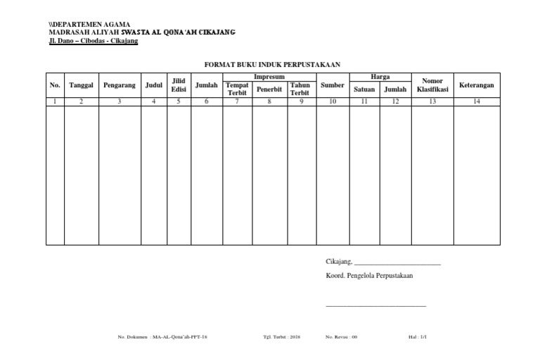 Tasikmalaya tgl penerimaan no induk pengarang judul edisi kota terbit penerbit tahun terbit bahasa asal koleksi harga no klasifikasi ket 4 jan 2012 1428 dzulmani mengenal kitab kitab hadis 1 yogyakarta insan madani 2008 indonesia block grand 2xz4 4 jan 2012 1429 rianty amanda terapi jus untuk kesehatan 1 bandung sanggabuana 2008. Format buku induk di perpustakaan sekolah dalam inventarisasi perpustakaan meliputi pemeriksaan bahan pustaka pemberian stempel dan pencatatatan di buku indukpada artikel ini akan memberikan gambaran tentang bagaimana membuat buku induk perpustakaan di sekolah. Softgaleri adalah blog yang berbagi informasi perangkat akreditasi paket sdmi smpmts smasmkma slb sederajat administrasi kelasakreditasi sekolahperangkat pembelajaran aplikasi dan administrasi guru yang mana file berikut ini adalah kumpulan dari berbagi sumber tentang format buku induk perpustakaan yang bisa bapakibu gunakan dan. Format buku induk perpustakaan. Contoh jam layanan perpustakaan sekolah. Tugas 3 buku induk perpustakaan smp negeri 1 bantarkalong kab.