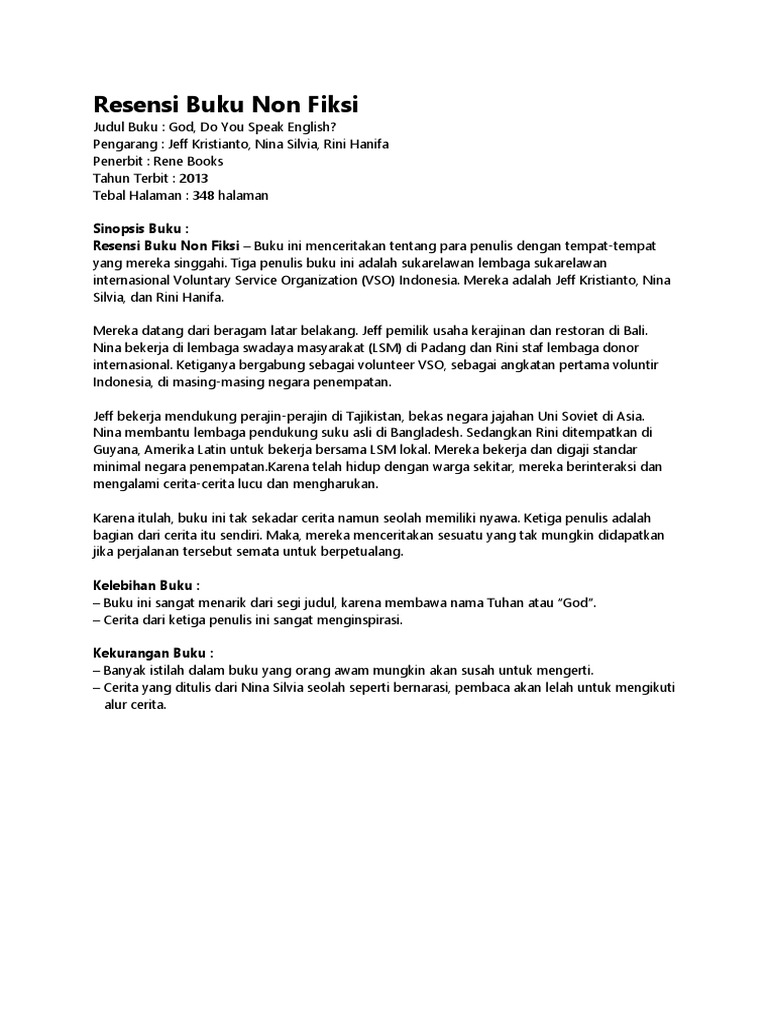 Contoh buku non fiksi dan penulisnya. Mereka yang dilumpuhkan sepertinya sama dengan arus balik fiksi sejarah. Pixabaydotcom contoh resensi buku non fiksi kata resensi berasal dari kata kerja dalam bahasa latin yakni recensere atau revidere. Arus balik sepertinya ini fiksi sejarah dan bukan non fiksi. Menurut kamus besar bahasa indonesia dalam menulis refleksi buku nonfiksi dan fiksi kata refleksi memiliki arti cerminan atau gambaran. Berikut contoh resensi buku non fiksi hingga ilmu pengetahuan. Satu buku fiksi dan satu lagi buku non fiksi.