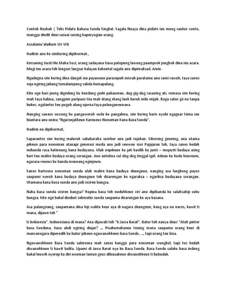 Berbicara mengenai bahasa apa yang dipakai tentunyaitu bukanlah sebuah masalah yang terpenting sesuai dengan tempat dan menggunakan bahasa yang baku. Dibawah ini akan dijelaskan contoh contoh teks ceramah. Ibu guru anu ku simkuring dipihormat. Pidato bahasa sunda pidato yang dibuat dalam bahasa sunda dinamakan biantara. Dalam contoh teks ceramah bahasa sunda tentang ilmu dan agama ini diambil dari pengajian hari jumat dengan judul ceramah yang dibawakan adalah ciri ciri orang sholeh atau dalam bahasa sundanya ciri ciri jalma soleh yang disampaikan oleh ust. Contoh pidato bahasa sunda pidato dalam pengaplikasiannya bisa menggunakan berbagai bahasa seperti bahasa indonesia dan bahasa sunda.
