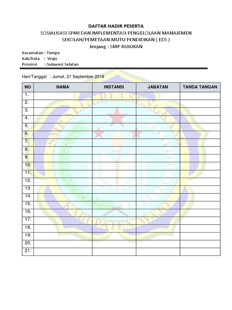 Contoh daftar hadir kegiatan pengembang kurikulum informasi guru berikut ini adalah contoh daftar hadir kegiatan pengembang kurikulum yang bisa anda download secara gratis di website kami. Silahkan dapatkan filenya dengan mengunduh link dibawah ini. Daftar hadir biasanya menampilkan data kegiatan waktu kegiatan jumlah peserta nama nama peserta asal entitasinstansi perusahaan dan penanggung jawab kegiatan. Diharapkan dengan artikel berjudul contoh sk berita acara daftar hadir tim pengembang kurikulum ini bisa memberikan manfaat banyak untuk anda dalam menunjang kinerja anda sebagai pendidik dan tenaga kependidikan. Contoh form daftar hadir rapat setiap perusahaan form daftar hadir pastilah berbeda beda. Inilah deretan contoh daftar hadir kegiatan pada umumnya daftar hadir ini di pergunakan untuk pendaftaran dalam menghadiri suatu event atau kegiatan seperti perumusan visi misi pengembangan kurikulum pramuka pmr pmii donor darah cfd dan lain sebagainya.