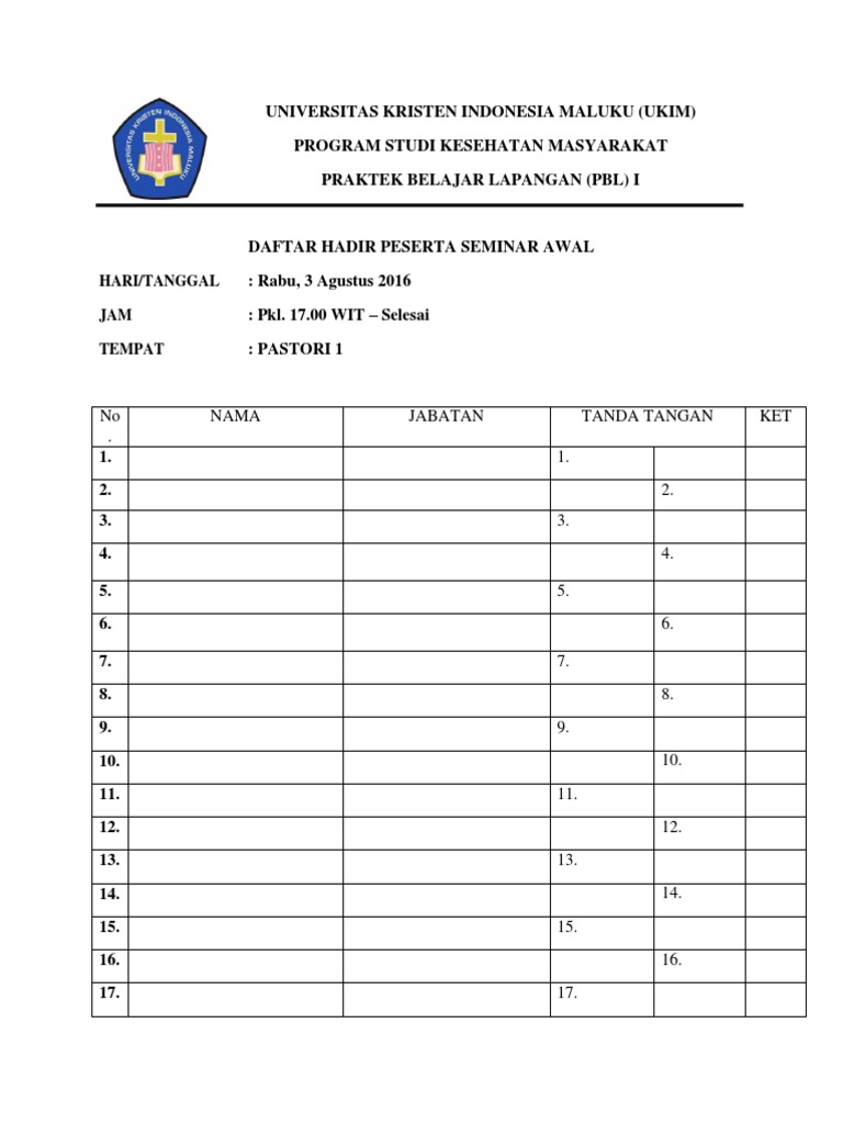 Kavling surya pabuaran rt 2. Kehadiran mahasiswa yang melakukan seminar dan dosen pembimbing bersifat mutlak dalam hal ini apabila salah satu diantaranya tidak dapat hadir maka seminar hasil dinyatakan batal dan diundur sesuai dengan kesepakatan. Daftar hadir panitia ppdb yang saya share kali ini saya buat dalam bentuk word agar mudah untuk di edit dan di sesuaikan dengan kebutuhan sekolah masing masing. Home contoh contoh daftar hadir peserta seminar. Berikut ini adalh contohnya.
