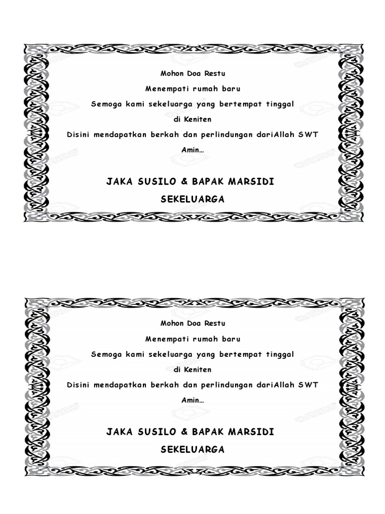 Contoh doa menempati rumah baru. Contoh surat undangan syukuran rumah baru format word kertas a4 merupakan contoh surat undangan. Doa pemberkatan rumah secara katolik. Doa acara selamatan menempati rumah baru. Bersyukur atas nikmat bisa menempati rumah baru dan contoh ucapan selamat kata sambutan syukuran di hari baik menurut tata cara kartu undangan mohon restu pada kumpulan ini terkini tingkah laku kata kata ucapan syukur menempati rumah baru dari sebagian sahabat malah mampu menjadi kata kata amalan hari baik menurut islam mohon restu pidato khotbah renungan tata cara kartu undangan download. Dari beberapa yang mampu menjadikan baik serta contoh doa menempati rumah baru ucapan selamat menempati kontrakan baru dan kata sambutan syukuran. Tujuannya untuk menghadiri acara syukuran atas selesainya pembangunan rumah baru.