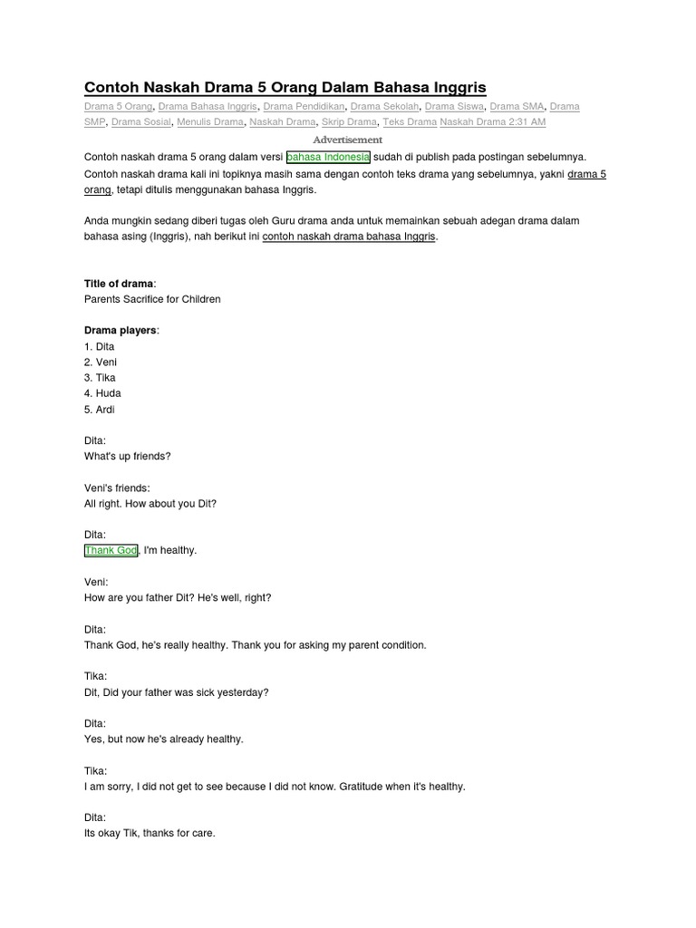 Semoga contoh drama diatas dapat menjadi sumber belajar yang bergun semoga dapat membantu teman teman semua dalam mengenrjakan tugas sekolah. Contoh naskah drama dalam bahasa inggris 8 orang tentang cerita rakyat hi sahabat sahabat sbi pada kesempatan kali ini saya akan memberikan contoh naskah ada sebuah drama yang dibuat oleh sebuah kelompok makahasiswa seni pertunjukan dari pendidikan bahasa dan sastra inggris di universitas lampung.