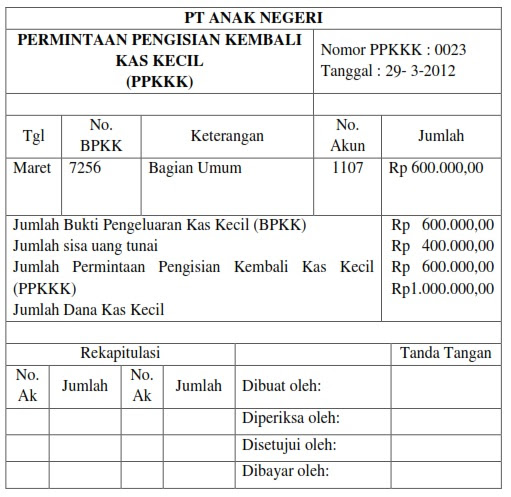 Dibulan ini juga dana kas kecil akan ditambah sebesar rp 28500000. Administrasi periode kas kecil. Istilah kata dana kas kecil atau petty cash found dapat kita artikan sebagai sejumlah uang yang telah disiapkan atau disediakan oleh instansi atau perusahaan yang berfungsi guna untuk membayarkan pengeluaran pengeluaran yang jumlah nominal rupiah nya tidak terlalu besar atau relatif kecil dan akan tidak ekonomis manakala harus dibayarkan dengan menggunakan cek. Pengeluaran kas sampai tanggal 19 desember 2015 sebesar rp. Dokumen ini diarsipkan oleh pemegang kas kecil menurut nama pengeluaran dana kas kecil tersebut. Pengisian kembali kas kecil setiap seminggu sekali pada awal bulan.