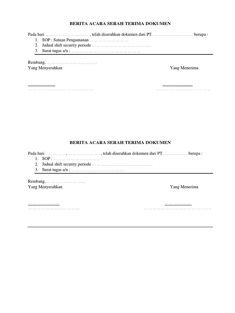 Contoh form serah terima barang. Dokumen surat serah terima barang merupakan dokumen penting yang harus diberikan ketika proses penyerahan barang. Semua itu karena surat ini adalah bukti sah transaksi perpindahan tangan dari suatu divisi perusahaan atau lembaga. Demikianlah berita acara serah terima barang ini di perbuat oleh kedua belah pihak adapun barang barang tersebut dalam keadaan baik dan cukup sejak penandatanganan berita acara ini maka barang tersebut menjadi tanggung jawab pihak kedua memlihara merawat dengan baik serta dipergunakan untuk keperluan tempat dimana barang itu dibutuhkan. Jadi biasakan menggunakan surat serah terima setiap melakukan transaksi baik berupa uang barang atau pun dokumen sebagai bentuk kesepakatan penyerahan dan penerimaan barang tersebut. Contoh surat serah terima barang dalam kegiatan perpindahan barang tentu saja memerlukan sebuah bukti sah yang dapat dipertanggung jawabkan ke depannya seperti surat serah terima barang. Berita acara serah terima barang merupakan termasuk dokumen penyerahan barang yang amat krusial.