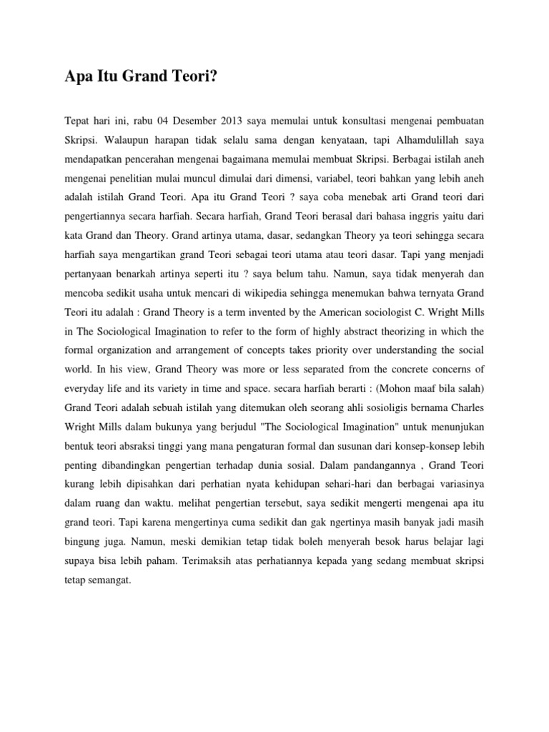 Contoh grand teori dalam skripsi. Sebagai upaya memberikan penjelasan lebih mendalam berikut ini adalah contoh penggunaan berbagai macam landasan teori dalam karya ilmiah baik itu makalah skripsi thesis laporan penelitian sampai dengan tugas. Mencari informasi terkait apa itu grand teori dalam skripsi. Tapi karena mengertinya cuma sedikit dan gak ngertinya masih banyak jadi masih bingung juga. Inilah contoh grand teori dalam pembuatan skripsi semoga bermanfaat. Agency theory absorptive capacity actor network theory adaptive structuration theory administrative behavior theory of agency theory argumentation theory clasical management chaos theory cognitive dissonance theory cognitive fit theory competitive strategy porter complexity theory contingency. Narrow teori menitikberatkan pada orang orang tertentu pada waktutertentumis.