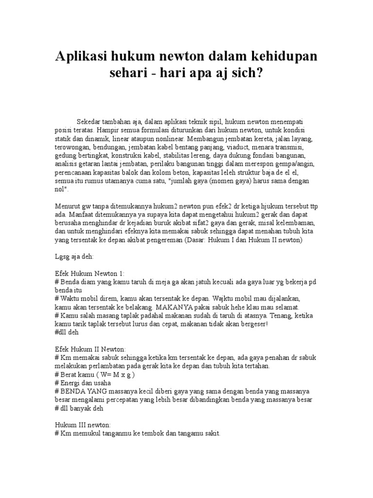Hukum hukum newton tentang gerak dapat menjelaskan beberapa peristiwa gerak dalam kehidupan sehari hari. Hukum newton i. Yuk check this out. Hukum i newton menyatakan jika resultan gaya yang bekerja pada benda sama dengan nol maka benda yang diam akan tetap diam dan benda yang bergerak akan terus bergerak lurus beraturan glb. Contoh hukum newton 1 dalam kehidupan sehari hari. Menurut hukum i newton suatu benda akan cenderung mempertahankan kedudukannya.