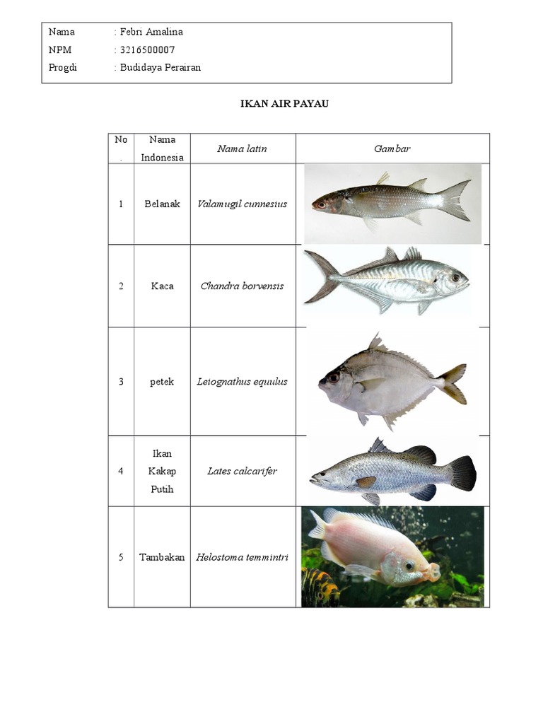 Contoh ikan air payau. Melimpahnya ikan laut di indonesia juga berarti variasi jenis ikan laut dan olahan masakannya juga sangat beragam. Air tawar dapat ditemukan di sumur sungai danau dan salju serta waduk bendung dan bendungan. Ikan ini juga memiliki bentuk tubuh yang cukup besar dan juga memiliki kepala yang hampir mirip dengan ular. Atau sedang mengerjakan tugas sekolah mengisi nama latin ikan. Ikan kakap ini tidak hanya hidup di air payau akan tetapi juga hidup di air asin atau air laut. Siapa sih yang tidak tau dengan ikan hanya saja nama latinnya yang kurang tau.