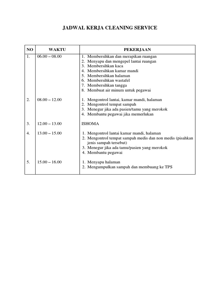 Contoh jadwal kerja cleaning service. Contoh kerangka acuan pengelolaan air bersih rs. Lowongan kerja medan cleaning service. Secara umum ada dua sistem jam kerja yang diterapkan perusahaan di indonesia yakni full time dan shift. Penggantian tenaga kerja. Contoh file berikut ini adalah kumpulan dari berbagi sumber tentang lowongan kerja medan cleaning service yang bisa bapakibu gunakan dan diunduh secara gratis dengan menekan tombol download biru dibawah ini. 1200 1300.