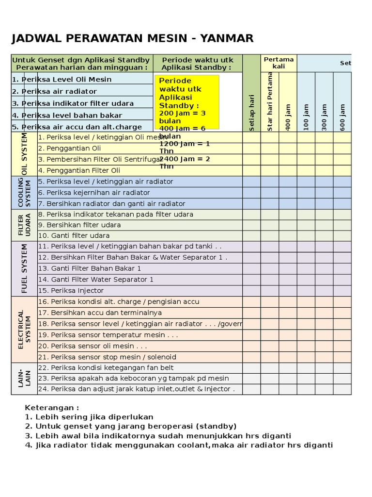 Contoh jadwal perawatan mesin. Contoh format checklist perawatan mesin. Contoh lembar checklist amdal gedung. Sebagi contoh untuk pabrik yang. Seperti halnya mesin mesin yang lain kompresor juga perlu perawatan pemeliharaan dasar untuk menjaga atau mempertahankan keandalan kinerja maksimum kompresor. Yang kontinyu 7 hari seminggu 3 shift sehari maka pekerjaan perawatan harus diatur ketika mesin sedang berhenti beroperasi. Jenis jenis maintenance perawatan mesinperalatan kerja yang dimaksud dengan maintenance adalah suatu kegiatan untuk merawat atau memelihara dan menjaga mesinperalatan dalam kondisi yang terbaik supaya dapat digunakan untuk melakukan produksi sesuai dengan perencanaan.