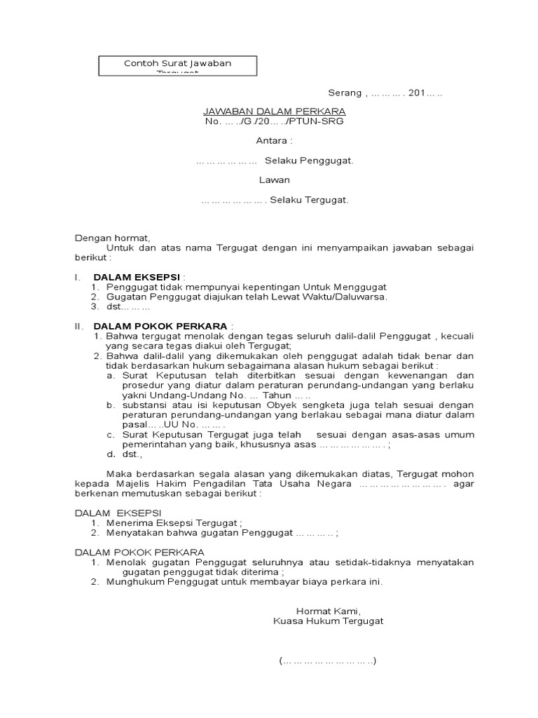 Contoh surat gugatan dan jawabannya gugatan cerai dalam perdata on may 22 2015 hukum 3 comments. Home advokasi contoh surat gugatan hukum pengadilan perdata contoh jawaban gugatan perkara perdata pmh recommended contoh jawaban gugatan perkara perdata pmh recommended pena merah 330 am no comments. Makassar 04 mei 2015. Contoh surat gugatan perdata tentang sengketa jual beli hak dan gugatan wanprestasi surat gugatan perdata merupakan sebuah surat yang berisikan tentang tuntutan atas hak hak yang dimiliki oleh pihak penggugat dan terbukti hak hal tersebut telah diambil oleh pihak tergugat. Bahwa dalil jawaban tergugat pada poin 3 yang mengelak atas pembayaran kerjasama yang belum dibayar dan menyatakan pada tanggal 25 desember kerjasama mereka telah berakhir itu tidaklah benar. Tidak jauh berbeda dengan membuat gugatan bagaimana bentuk dan susunan dari jawaban gugatan dan eksepsi dalam perkara perdata tidak diatur oleh peraturan perundang undangan kecuali hanya disebutkan bahwa gugatan harus memenuhi syarat formal.