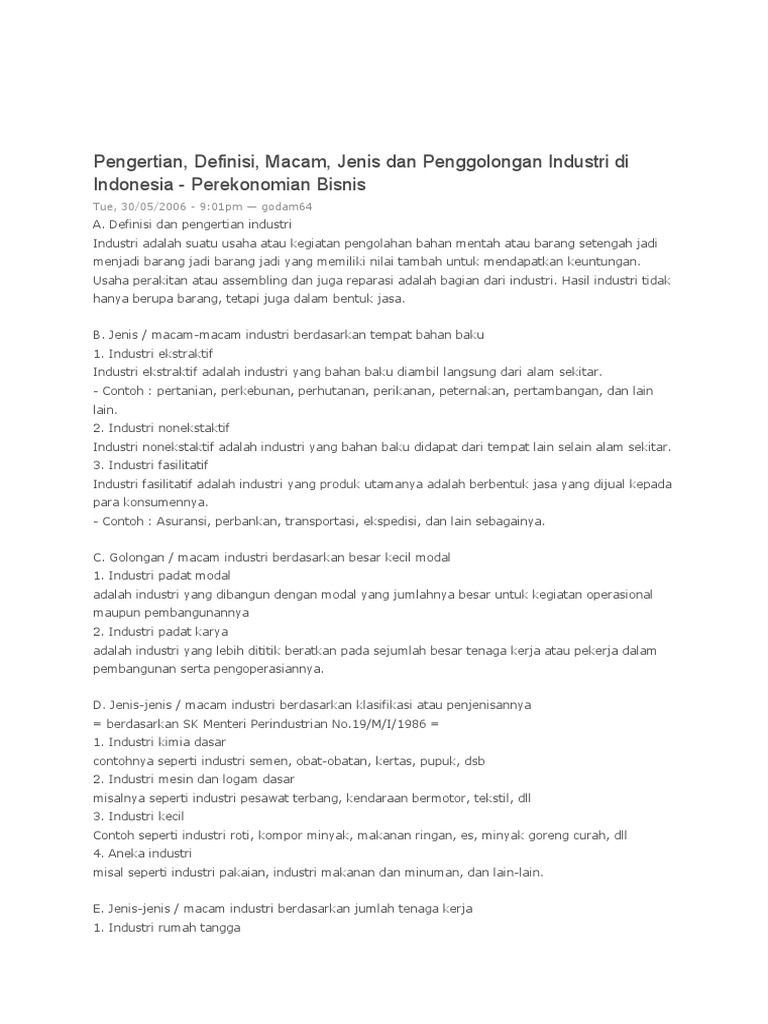 Contoh jenis jenis industri. Di zaman yang sudah modern dan maju ini limbah yang di hasilkan semakin meningkat. Contoh limbah industri. Pada bumbu dan bahan untuk memasak misalnya seperti minyak goreng tepung terigu kaldu ayam mentega margarin dan lain lain. Industri bersama yaitu biasa dikenal dengan istilah join venture industry yakni jenis industri yang modalnya hasil kerja sama antara pengusaha swasta nasional atau modal pemerintah dengan modal dari negara lain. Industri kecil yaitu industri yang tenaga kerjanya berjumlah sekitar 5 sampai 19 orang. Nah penjelasan diatas merupakan sedikit materi tentang pengertian industri beserta pembahasan lengkap tentang jenis industri di indonesia dan contohnya.