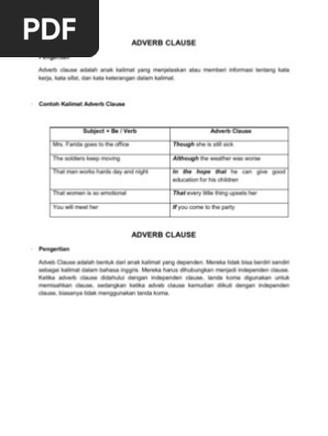 Adverb clause merupakan jenis klausa yang berperan sebagai adverb dalam satu kalimat. You were sleeping when she arrived. Dia tiba ketika kamu sedang tertidur keterangan. Dalam grammar bahasa inggris ada begitu banyak jenis klausa seperti noun clause adjective clause dan tentu saja kita tidak dapat melewatkan adverb clausenamun permasalahannya masih banyak orang yang kurang paham mengenai apa itu adverb clause dan penggunaannya. Kata penghubungnya conjunction antara lain. Jika ada lebih dari satu kata adverb di dalam suatu kalimat kita perlu mengikuti aturan adverb order.