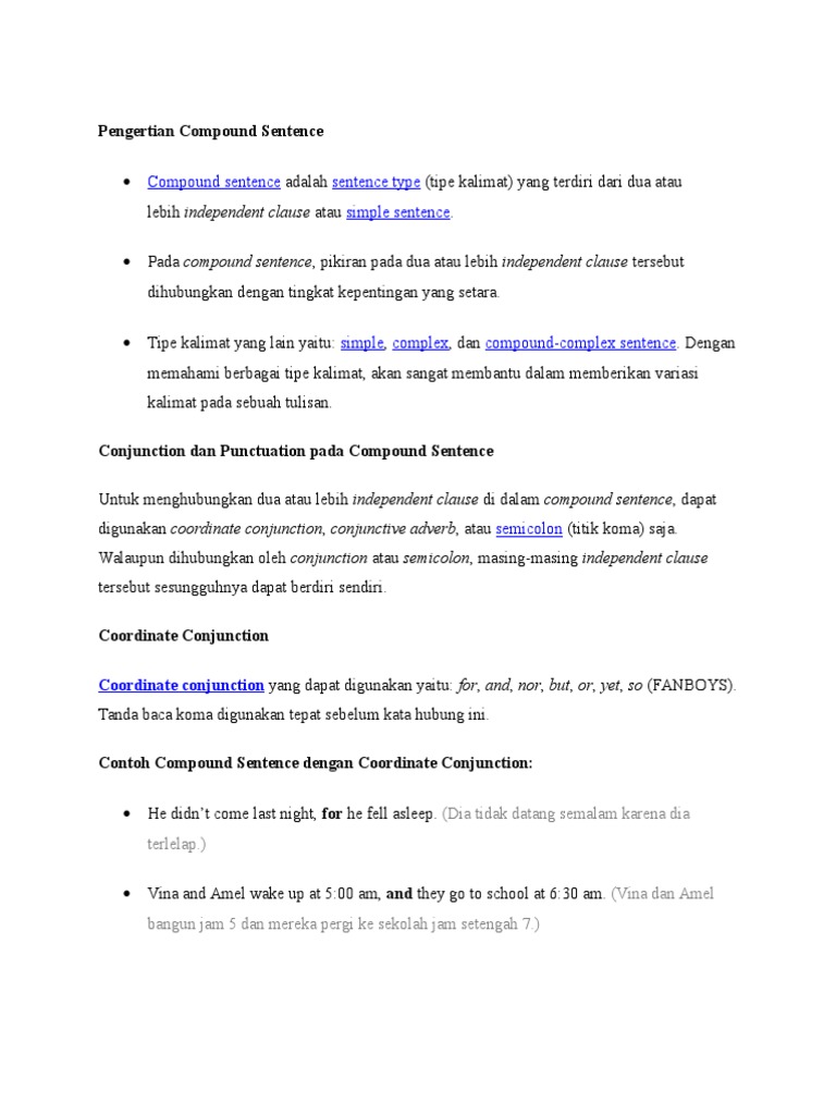Karena kamu telat kita tidak bisa menonton film itu dari awal dan saya perlu menontonnya ulang dependent clause. Contoh compound sentences dan artinya menggunakan penghubung fanboys. Pengertian dan 9 contoh kalimat compound complex sentence selain simple sentence compound sentence dan complex sentence ada lagi satu tipe kalimat yang perlu dipelajari yaitu compound complex sentence. I will give you a call after i get the news. Compound complex sentence adalah sentence type tipe kalimat yang merupakan kombinasi antara compound sentence dan complex sentencetipe kalimat ini memiliki 3 atau lebih klausa di dalamnya dimana minimal ada 2 independent clause dan 1 dependent clause. Soal sentence types pengertian compound complex sentence.