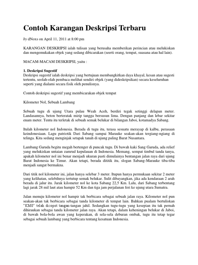 Karangan ini mempunyai karakteristik menggambarkan peristiwa atau objek sehingga pembaca dapat seolah olah merasakan melihat atau mengalami sendiri hal yang dibahas. Seperti proyek penulisan lain pastikan anda membaca ulang dan merevisi dengan cermat untuk memastikan hasil tulisan sudah bagus. Namun deskripsi pribadi harus singkat jelas dan menarik. Biasanya paragraf singkat berisi 3 sampai 5 kalimat atau sekitar 100 sampai 200 kata sudah cukup untuk mengemukakan detail penting. Contoh karangan deskripsi singkat dalam bahasa indonesia karangan deskripsi adalah salah satu dari jenis jenis karangan. Begitu pula pada teks deskripsi yang umumnya digunakan untuk menggambarkan suatu hal.