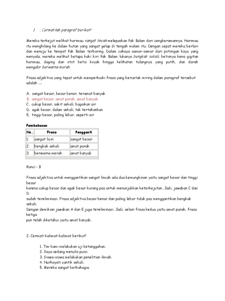 Anak kecil beban berat baju merah meja bundar alam gaib pemain ganda adjektiva dapat juga merupakan inti frasa yang disebut frasa adjektival. Sebagai inti frasa adjektiva dapat diwatasi dengan berbagai pemarkah seperti pemarkah aspektualitas dan pemarkah modalitas yang ditempatkan di sebelah kirinya. Contoh frasa preposisional dalam bahasa indonesia salah satu jenis jenis frasa dalam bahasa indonesia berdasarkan kategori katanya adalah frasa preposisional atau frasa preposisi. Untuk melengkapi jenis jenis frasa dalam artikel kali ini kita akan membahas tentang contoh frasa adjektiva dalam kalimat lengkap dengan pengertian. Frasa yang terdapat pada kalimat contoh di atas adalah penting dan di dalam kalimat tersebut bisa dikategorikan sebagai kalimat frasa adjektiva karrena dikombinasi dengan unsure inti yanitu kata penting berkategori dengan kata sifat yang termasuk adjektiva dan dikombinasikan dengan kata lebih. Unsur intinya yaitu kata penting berkategori kata sifat adjektiva yang dikombinasikan dengan kata lebih.
