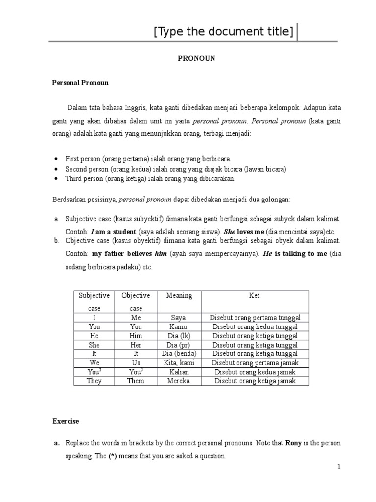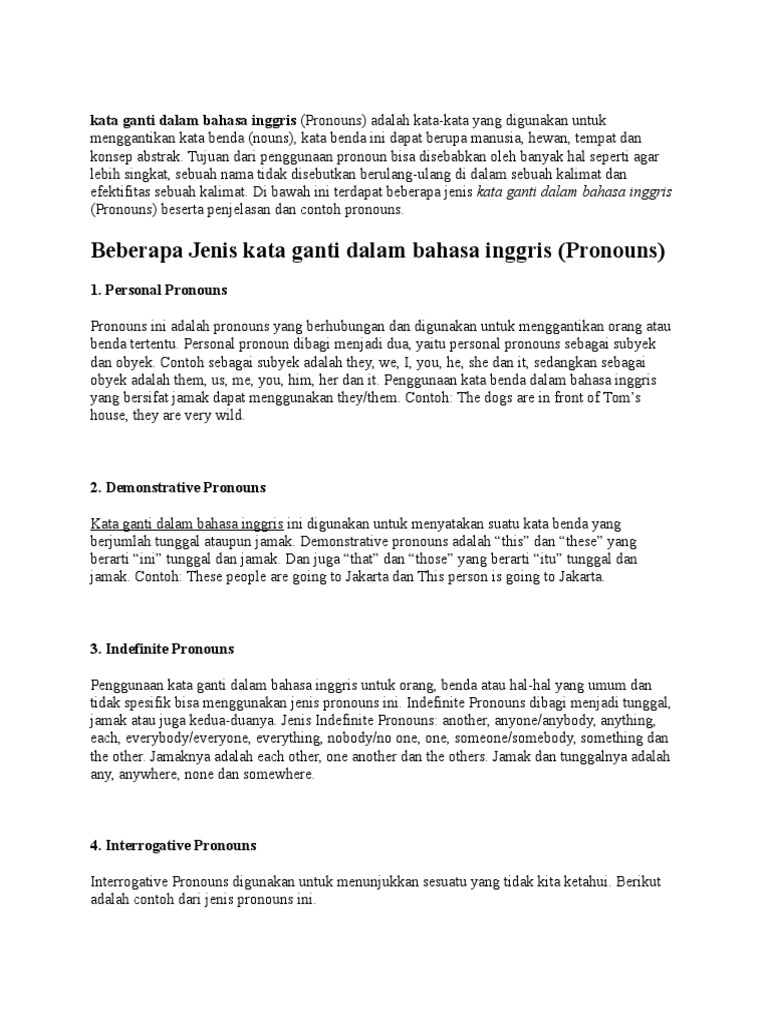 Englishcoo kata ganti dalam bahasa inggris contoh pronoun seperti i me you they them we us she her he him it dan masih banyak lagi. Pronomina menyesuaikan konteks kalimat. Semua dibahas lengkap jenis jenis kata ganti dan contoh kalimat beserta artinya. Berdasarkan pengertian fungsi dan contoh kata ganti dalam kalimat yang telah diuraikan diatas maka dapat kita simpulkan bahwa kata ganti pronomina adalah suatu jenis kata yang berfungsi sebagai pengganti nomina lain atau kata lain. Pengertian kata ganti fungsi ciri jenis dan contoh kata ganti promina dalam bahasa indonesia lengkap kata ganti atau promina adalah jenis kata yang menggantikan nomina atau frasa nomina. Kata ganti merupakan kata yang dipergunakan sebagai pengganti subyek maupun obyek berupa benda dan orang.