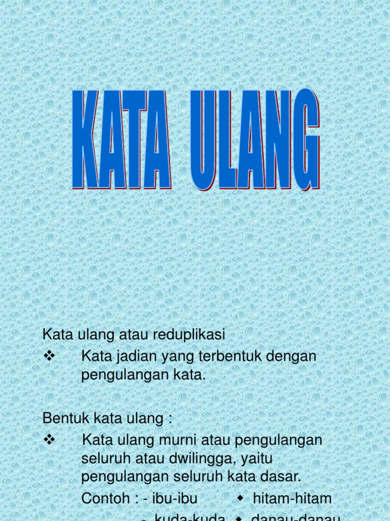 Contoh lain adalah kata berulang yang mendapat sufiks termasuk. Kata ulang yang bermakna sifat atau agak merupakan kata ulang yang menghasilkan kata dengan makna gambaran sifat atau kata bermakan agak. Kata ulang berubah bunyi. Buah kedondong yang dibeli ibu kemarin di pasar rasanya sedikit keasam. Menurut kamus besar bahasa indonesia kata berarti unsur bahasa yang diucapkan atau dituliskan yang merupakan perwujudan dari kesatuan perasaan dan pikiran yang dapat digunakan dalam berbahasa. Reduplikasi atas seluruh bentuk dasar bisa kata dasar maupun kata berimbuhan.