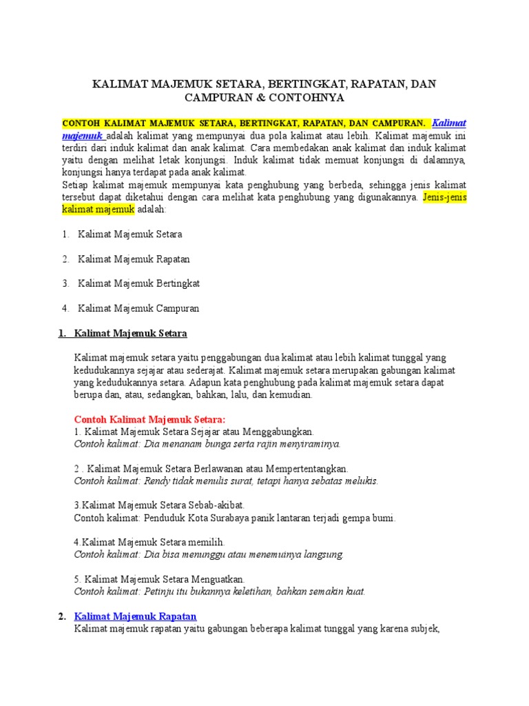 Kalimat ini ditandai dengan penggunaan konjungsi seperti ketika sejak sebelum sesudah tatkala dan lain sebagainya. Konjungsi yang digunakan dalam kalimat majemuk bertingkat adalah ketika karena supaya meskipun jika dan sehingga. Hubungan antara klausa pada kalimat majemuk campuran setara dan juga bertingkat. Laras tidak dapat bersekolah hari ini karena tengah sakit keras. Ayah sedang membaca koran. Kalimatid contoh kalimat majemuk setara dalam bahasa indonesia kalimat dibedakan menjadi berbagai jenis.