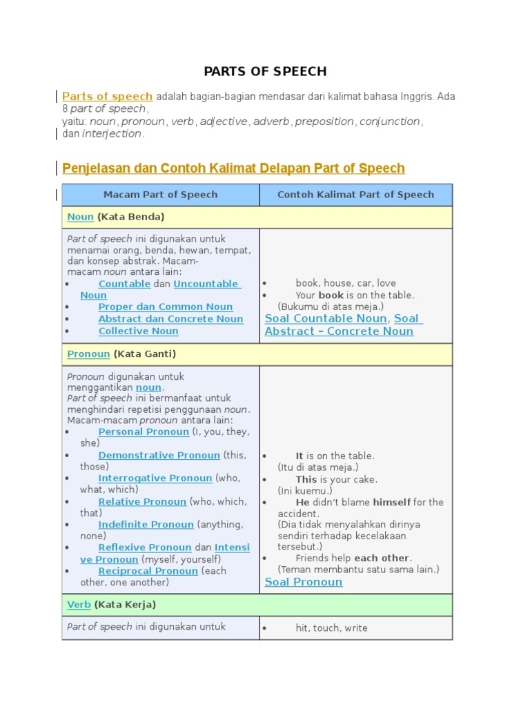 10 contoh pembuka dan penutup pidato dalam bahasa inggris yang baik dan benar sahabat sbi dirumah sedang mencari referensi contoh pembuka atau penutup pidato dalam bahasa inggris. Conjunction kata penghubungpart of speech ini berfungsi untuk menhubungkan dua kata frasa atau paragrafcontoh. Dalam bahasa inggris terdapat delapan jenis part of speech atau yang lebih dikenal sebagai kelas kata yakni. Yang termasuk 50 contoh kalimat part of speech dalam bahasa inggris dengan adjective. Umumnya noun didahului oleh partikel a andan the. Macam macamnya antara lain countable dan uncountable noun proper dan common noun abstract dan concrete noun dan collective noun.