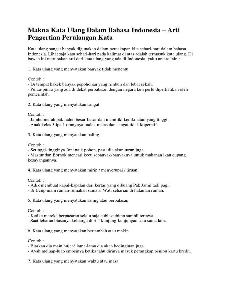 Contoh kalimat yang menggunakan kata ulang. Sejak ayah sakit sakitan ibu menjadi tulang punggung keluarga. Oleh karena itu berikut akan di tampilkan contoh contoh penggunaan kata ulang dalam kalimat. Kata ulang merupakatan kata yang dihasilkan dari proses reduplikasi atau pengulangan. Hanya sekedar contoh pasti terasa kurang. Kata ulang yang bermakna makin atau bertambah merupakan pengulangan kata dasar baik yang menggunakan tambahan atau tidak sehingga menghasilkan kata yang berarti makin. Kata ulang adalah adalah kata yang mengalami proses pengulangan atau reduplikasi satuan gramatik baik seluruhnya maupun sebagian.