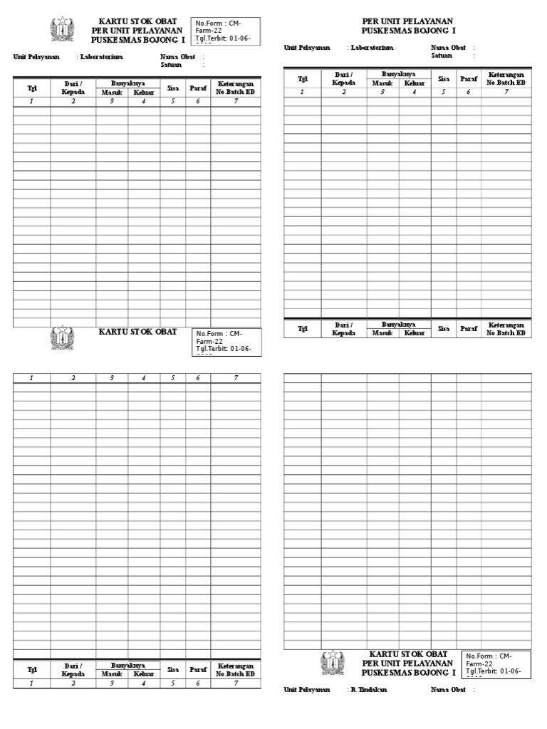 Kartu stok obat sebagai pengendali persediaan barang untuk apotek dan toko obat harus dimiliki dan diupdate secara berkala. Arus keluar masuk barang dan penataan yang semrawut kotor serta tidak aman akan mempercepat laju kebangkrutan perusahaan. Blanko pesanan obat blanko kartu stok blanko salinan resep blanko faktur blanko nota penjualan buku pembelian buku penerimaan buku pengiriman buku kasbuku penerimaan dan pengeluaran narkotika dan psikotropika form laporan laporan obat serta alat tulis kantor lainnya. Pengelolaan ketersediaan obat juga akan memberitahu kapan produk obat tersebut belum habis juga sejak masa pembeliannya. Documents similar to kartu stok obatdocx. Dokumen ini merupakan dokumen yang digunakan pada saat terjadi pelaksanaan stock opnamekartu ini akan menyediakan informasi tentang nama barang tipe barang lokasi barang dan lokasi kosong untuk jumlah jenis kemasan satuan tanda tangan orang gudang non gudang dan auditor.