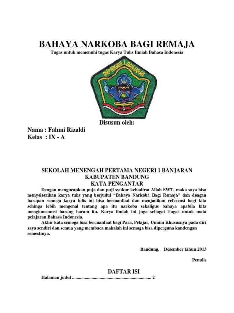 15 manfaat penulisan manfaat penulisan karya tulis ini adalah agar masyarakat dapat mengetahui sejauh mana dampakpengaruh penyalahgunaan narkoba di kalangan remaja. Karena narkoba akan mengancam hidupmu. Karya tulis ilmiah tentang bahaya narkoba kata pengantar alhamdulillah dengan rahmat dan hidayah allah swt maka kami bisa menyelesaikan makalah yang berjudul bahaya narkoba dan dengan harapan semoga makalah ini bisa bermanfaat dan menjadikan referensi bagi kita sehinga lebih mengenal tentang apa itu narkoba sekaligus bahaya apabila kita mengkonsumsi barang haram itu. Dengan mengucapkan puja dan puji syukur kehadirat allah swt maka saya bisa menyelesaikan karya tulis yang berjudul bahaya narkoba bagi remaja dan dengan harapan semoga karya tulis ini bisa bermanfaat dan menjadikan referensi bagi kita sehinga lebih mengenal tentang apa itu narkoba sekaligus bahaya apabila kita mengkonsumsi barang haram itu. Nah untuk teman teman yang masih duduk di bangku pelajarmahasiswa kali ini admin akan membagikan artikel gratis untuk membantu menyelesaikan tugas tentang contoh karya ilmiah lengkap tentang tentang bahaya narkoba bagi remajauntuk lebih jelasnya mari kita baca artikelnya berikut ini. Penulisan karya tulis ilmiah ini dimaksudkan untuk memberikan informasi kepada pembaca tentang narkoba dan bahayanya bagi generasi muda.