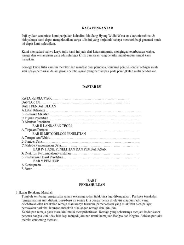 Contoh karya tulis ilmiah tentang bahaya merokokkumpulan makalah ilmiahcontoh karya tulis ilmiah tentang bahaya merokok. Karya ilmiah tentang bahaya merokok kata pengantar syukur alhamdulillah merupakan satu kata yang sangat pantas penulis ucapkan kepada allah swt yang karena bimbingan nya maka penulis bisa menyelesaikan sebuah karya tulis yang berjudl bahaya merokok bagi pelajar. Contoh karya tulis ilmiah tentang bahaya merokok. Melalui resolusi tahun 1983 organisasi kesehatan dunia who telah menetapkan tanggal 31 mei sebagai hari bebas tembakau sedunia setiap tahunbahaya merokok terhadap kesehatan tubuh telah diteliti dan dibuktikan oleh banyak orangefek efek yang merugikan akibat merokok pun sudah diketahui dengan jelasbanyak penelitian membuktikan bahwa kebiasaan merokok meningkatkan risiko timbulnya berbagai. Contoh karya tulis ilmiah bahaya merokok memang saat ini banyak siswa dan siswi untuk memberikan salah satu karya tulis ilmiah mereka untuk di sampaikan di dosen atau si sekolah mereka maka dengan ini kami sampaikan sehingga apa yang kamu inginkan bisa tercapi dengan sangat maksimal untuk membuat karya tulis ilmiah baha merokok untuk judul yang kami sampaikan dibawah ini. Karya tulis ilmiah bahaya merokok.