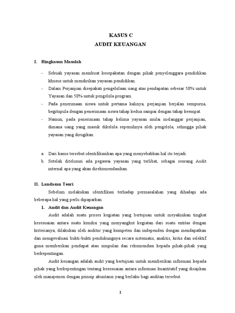 Jasa yang diberikan termasuk hasil akhir berupa penulisan laporan audit internal dan semua data pendukung dari audit yang dilakukan. Contoh kasus dan pemecahan masalah mengenai audit keuangan free download as word doc doc docx pdf file pdf text file txt or read online for free.
