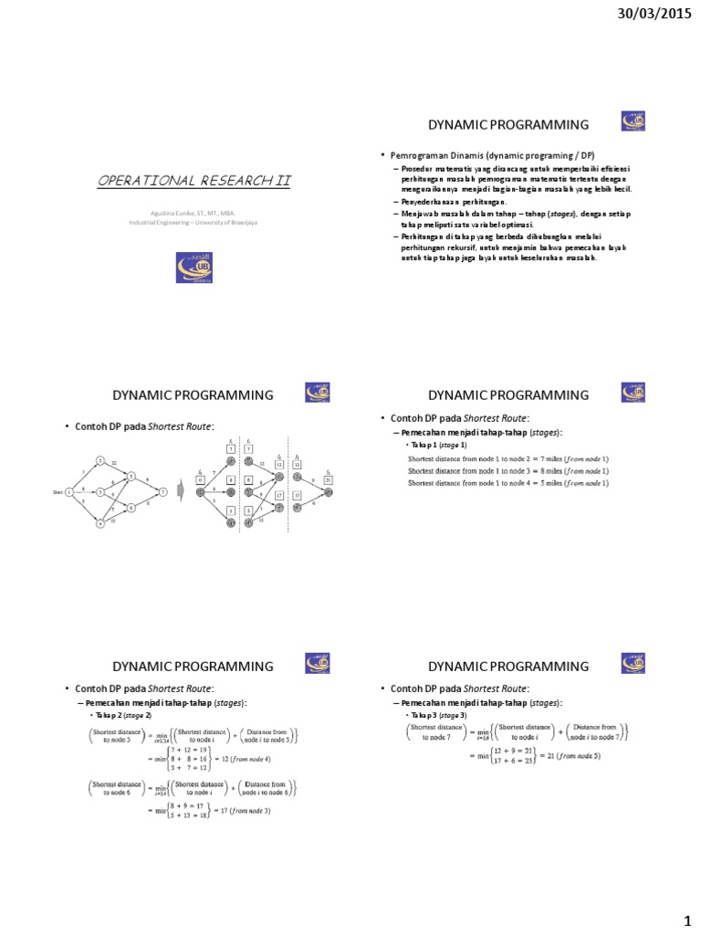 Contoh kasus dynamic programming. Untuk dua kasus pertama waktu minimum gabung dan lepas diambil 1 jam untuk tiap tiap unit. Dynamic programming biasa disingkat dp adalah suatu teknik algoritma untuk memecahkan masalah dimana solusi optimal dari masalah tersebut dapat dipandang sebagai suatu deret keputusan. Dynamic programming dp is a problem solving method by breaking the problems down into subproblems that are easier to manage. Contoh kasus dan implementasi dengan menggunakan microsoft excel tugas akhir diajukan untuk memenuhi salah satu syarat. Unit 3 unit 2 unit 1 unit 4. Tinjau masalah penukaran uang.