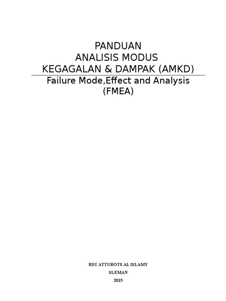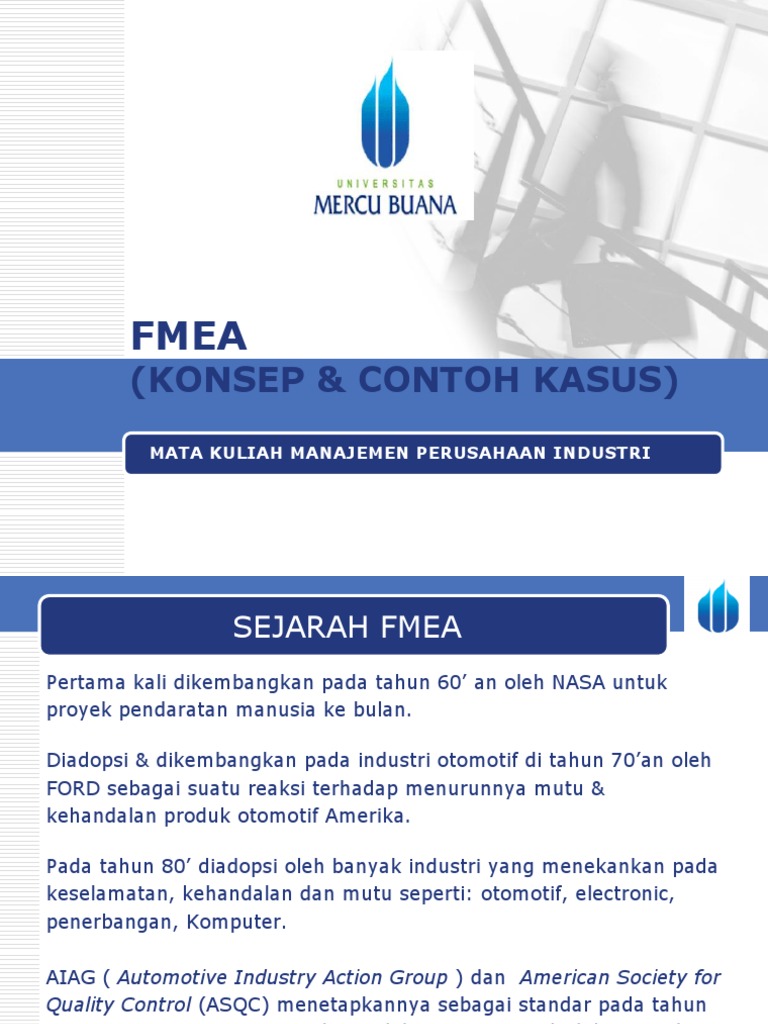 Fmea merupakan teknik evaluasi tingkat keandalan dari sebuah sistem untuk menentukan efek dari kegagalan dari sistem tersebut. Fmea failure mode and effects analysis adalah alat yang digunakan secara luas pada industri otomotif aerospace dan elektronik untuk mengidentifikasi memprioritaskan dan mengeliminasi potensi kegagalan masalah dan kesalahan sistem pada desain sebelum produk. Ini adalah hasil dari mekanisme kegagalan penyebab modus kegagalan sebagai contoh. Pada proses pengujian lemari es laboratorium belum memiliki analisis resiko yang dibutuhkan untuk mengendalikan resiko. Format tabel dapat bervariasi. Dalam penelitian ini menggunakan metode fmea yang digunakan untuk mengidentifikasi failure mode terbesar dan efeknya yang menyebabkan kecacatan pada cetakan lks.