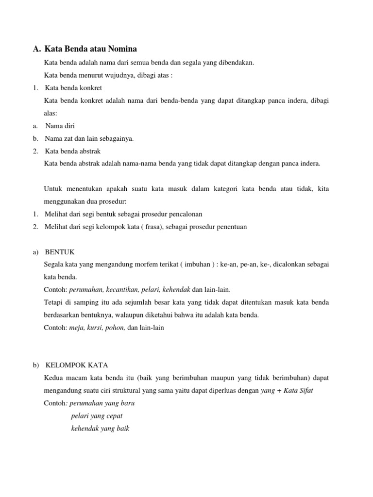 Kata benda dalam bahasa inggris kata benda adalah kata yang menyatakan orang tempat hewan benda dan segala yang dibendakan pikiran panca indera profesi dan lain sebagainyacontoh dari kata benda misalnya buku perpustakaan meja dsb. Itulah sekilas mengenai pengertian dan contoh kata konkret dan kata abstrak. Kata benda dasar ialah merupakan kata yang menunjukkan wujud suatu benda baik secara konkret maupun abstrak. Kata kata benda yang tak berwujud dapat dibentuk dari kata sifat kata benda umum common noun contoh kalimat verb dan kata kata lainnya. Kata benda turunan adalah kata benda yang mendapat penambahan imbuhan baik berupa awalan akhiran sisipan atau awalan akhiran yang disebut dengan afiksasi. Dalam artikel 100 contoh kata benda abstrak dalam bahasa inggris ini kita akan membahas lebih lanjut dan detail kata benda abstrak abstract noun.