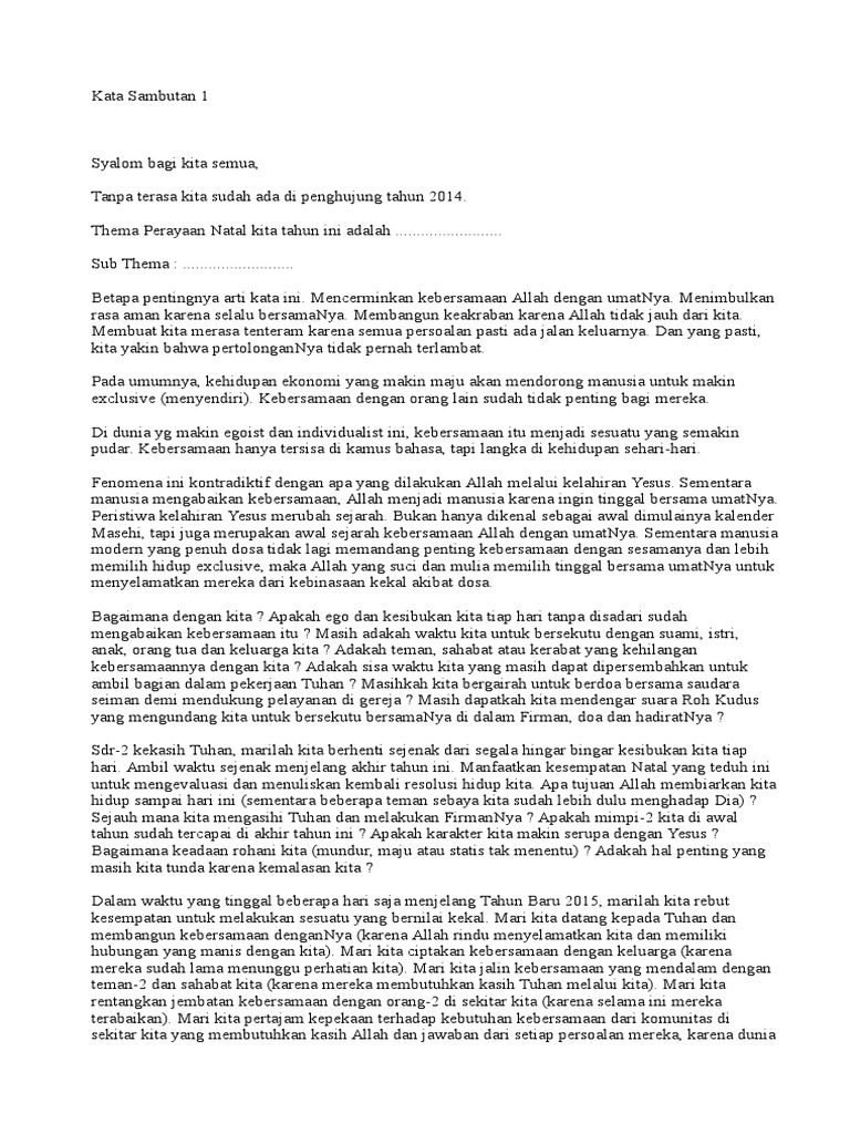 Thema perayaan natal kita tahun ini adalah the excellent christmas dengan sub thema immanuel allah menyertai kita. Contoh kata sambutan kita tentunya sudah pernah menghadiri suatu acara baik itu formal atau nonformal nah dalam suatu acara tersebut banyak sekali kita lihat kata sambutan yang biasanya disampaikan oleh tokoh penting dalam suatu acara tersebut misalkan acara perpisahan sekolah biasanya akan ada kata sambutan dari kepala sekolah. Wb yang saya hormati bapak ketua lingkungan dan yang saya hormati bapak lurah dan yang saya banggakan semua tamu undangan yang teleh meluangakan waktu nya utuk menghadiri acara ini sehingganya kita semua dapat di berikan keberkahan oleh alloh swt. Mengawali sambutan ini marilah kita panjatkan syukur kehadirat tuhan yang mahakuasa karena atas berkat rahmat dan karunianyalah yang telah memberikan kita kesehatan dan kesempatan untuk dapat berkumpul di tempat ini dalam rangka perayaan natal bersama solidaritas mahasiswa kristen universitas bumi hijrah maluku utara dan pemuda gmih wilayah kecamatan oba utara tahun 2013 ini. Contoh kata sambutan ketua natal naposo gado gado contoh pidato sambutan ketua panitia dalam bahasa inggris beserta gpdi shekina bsd news christmas celebration working out your perayaan natal 2017 di rutan cipinang menyusun teks pidato ketua panitia dan ketua organisasi oleh bambang. Sebelum saya mengakhiri sambutan saya pada malam natal hari ini saya selaku ketua panitia mohon maaf yg sebesar besarnya kepada semua yang hadir di tempat ini jika belum merasa puas dalam pelayanan suasana acara dan fasilitas mau pun kata kata yang tidak berkenan di hati saudara saudari.