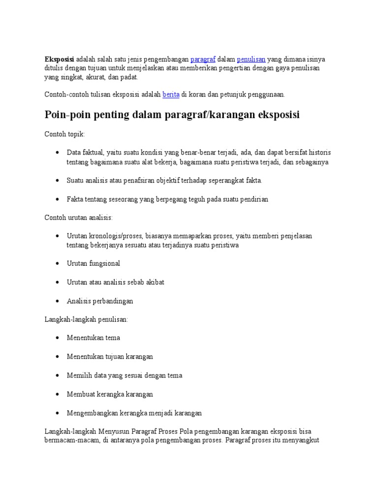 Paragraf eksposisi adalah sebuah paragraf yang mengadung penjelasan explanation informasi information atau juga pengetahuan yang berkaitan pada topik yang. Contoh teks eksposisi teks eksposisi merupakan suatu tulisan yang berisi fakta atau informasi berbentuk pengembangan paragraf yang berupaya untuk menerangkan suatu keadaan tertentu sehingga orang yang membacanya mendapatkan pengetahuan dari apa yang diuraikan oleh penulis.
