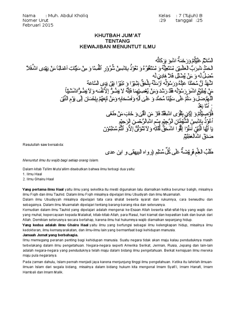 Ilmu yang wajib dipelajari bagi manusia adalah ilmu yang menuntut untuk diamalkan saat itu adapun ketika amalan tersebut belum tertuntut untuk diamalkan maka belum wajib untuk dipelajari. Read menuntut ilmu from the story materi khutbah jumat pilihan by mazyanmazred rediyanto with 14018 reads.