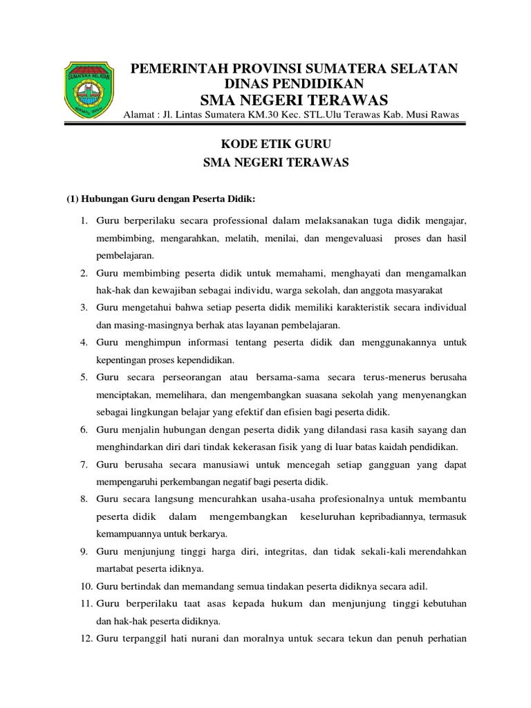 Hubungan guru dengan para peserta didiknya. Pelanggaran terhadap kode etik guru dapat dijatuhi sanksi hingga pencabutan profesi serta hak dan kewajiban sebagai guru. Berikut ini ada beberapa contoh deri kode etik guru yang mudah untuk dipahami. Guru berbakti membimbing anak didik seutuhnya untuk membentuk manusia pembangun yang berjiwa pancasila. Kode etik guru indonesia dapat dirumuskan sebagai himpunan nilai nilai dan norma norma profesi guru yang tersusun dengan baik dan sistematik dalam suatu sistem yang utuh dan bulat soetjipto dan kosasi 1999.