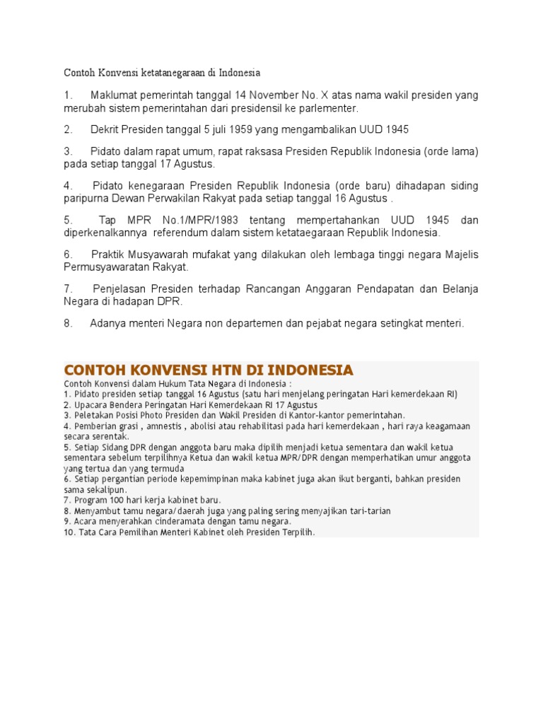 Mulai dari pengertian fungsi konstitusi dan contoh konstitusi tertulis dan tidak tertulis secara detil. 8 contoh konstitusi tertulis dan tidak tertulis di indonesia. Contoh konvensi dalam hukum tata negara di indonesia. Pengertian konvensi ciri ciri jenis dan contoh konvensi lengkap konvensi berasal dari kata convention yang berarti suatu aturan yang didasarkan pada kebiasaan. Demikianlah pembahasan mengenai konvensi. Contoh konvensi konvensi yang ada di indonesia.
