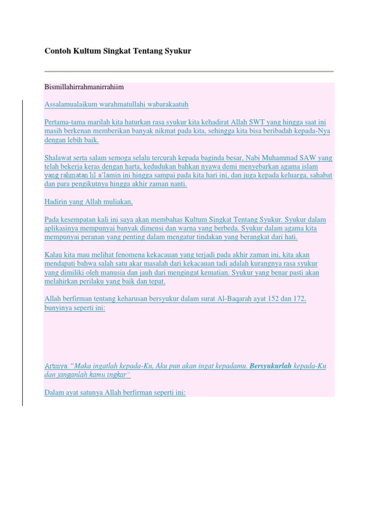 Khutbah jumat singkat tentang mensyukuri nikmat allah oleh. الحمد لله الذي أذهب الباس أشكره على نعم مختلفة الأنواع والأجناس. Contoh kultum singkat tentang syukur. Kultum singkat tentang bersyukur. Mari turut menyebarkan link kajian kultum singkat tentang bersyukur kepada allah di media sosial yang anda. Contoh teks prosedur sederhana kompleks dan protokol.