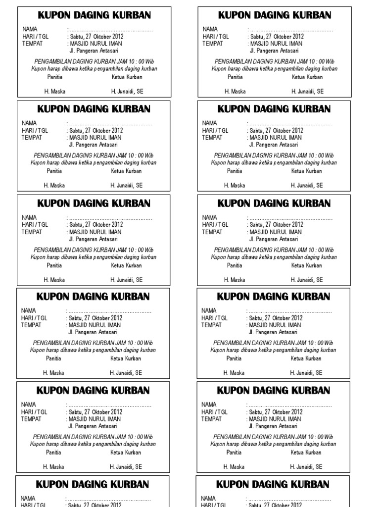 Contoh kupon qurban idul adha nusagates. Insyaa allah hari raya idul adha ini jatuh pada 10 dzulhijjah 1440 h atau tepat pada hari minggu tanggal 11 agustus 2019 yang akan datang. Tujuan admin simpan kedalam versi yang lebih rendah adalah agar memudahkan dalam proses pengeditan nantinya bagi para desainer grafis yang menggunakan aplikasi coreldraw x7 kebawah sampai coreldraw x4. Pada prosesnya pembagian hewan qurban sering menjadi kendala jika kita tidak diberikan penanda bagi warga yang sudah ataupun belum mendapatkannya. Idul adha bahasa arab. X panitia idul qurban 2012 mesjid al hidayah andir tengah id card panpel qurban 1435 h contoh susunan panitia qurban idul adha the leader s panitia qurban ponpe.