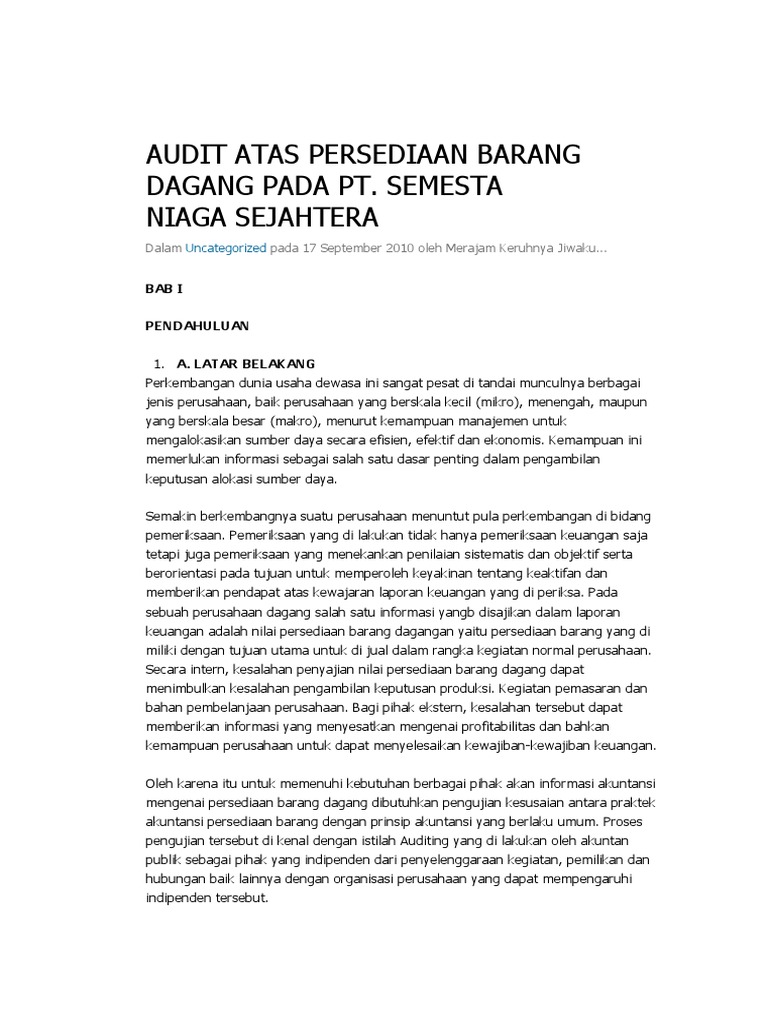 Contoh laporan audit internal perusahaan dagang. Berikut ini adalah download rpp silabus prota prosem kkm skkd ktsp 2006 sd kelas 5 yang merupakan kumpulan file dari berbagi sumber documentktsp 2006ktsp sdrpp silabus tentang contoh laporan audit internal perusahaan dagang. Menurut sukrisno agoes 2004221 internal audit pemeriksaan intern adalah pemeriksaan yang dilakukan oleh bagian internal audit perusahaan baik terhadap laporan keuangan dan catatan akuntansi perusahaan maupun ketaatan terhadap kebijakan manajemen puncak yang telah ditentukan dan ketaatan terhadap peraturan pemerintah dan ketentuan ketentuan dari ikatan profesi. Ruang lingkup audit yang dilakukan adalah audit atas laporan keuangan yang terdiri atas neraca laporan laba rugi laporan arus kas laporan perubahan ekuitas dan catatan atas laporan keuangan audit yang dilakukan juga menelaah struktur pengendalian internal mengidentifikasi kelemahan dan masalah yang timbul dalam pelaksanaan. Melakukan audit pada perusahaan dagang dapat dilakukan dengan mudah ketika perusahaan telah memiliki sebuah sistem yang mengintegrasi semua laporan kesehatan bisnis mulai dari laporan keuangan inventory piutang dan hal lainnya. Dari data data laporan laba rugi perusahaan pt adaro energy tbk yang sudah diaudit dalam 5 tahun terakhir yang disajikan di atas dapat diketahui bahwa. Audit perusahaan dagang dan manufaktur audit perusahaan dagang a.